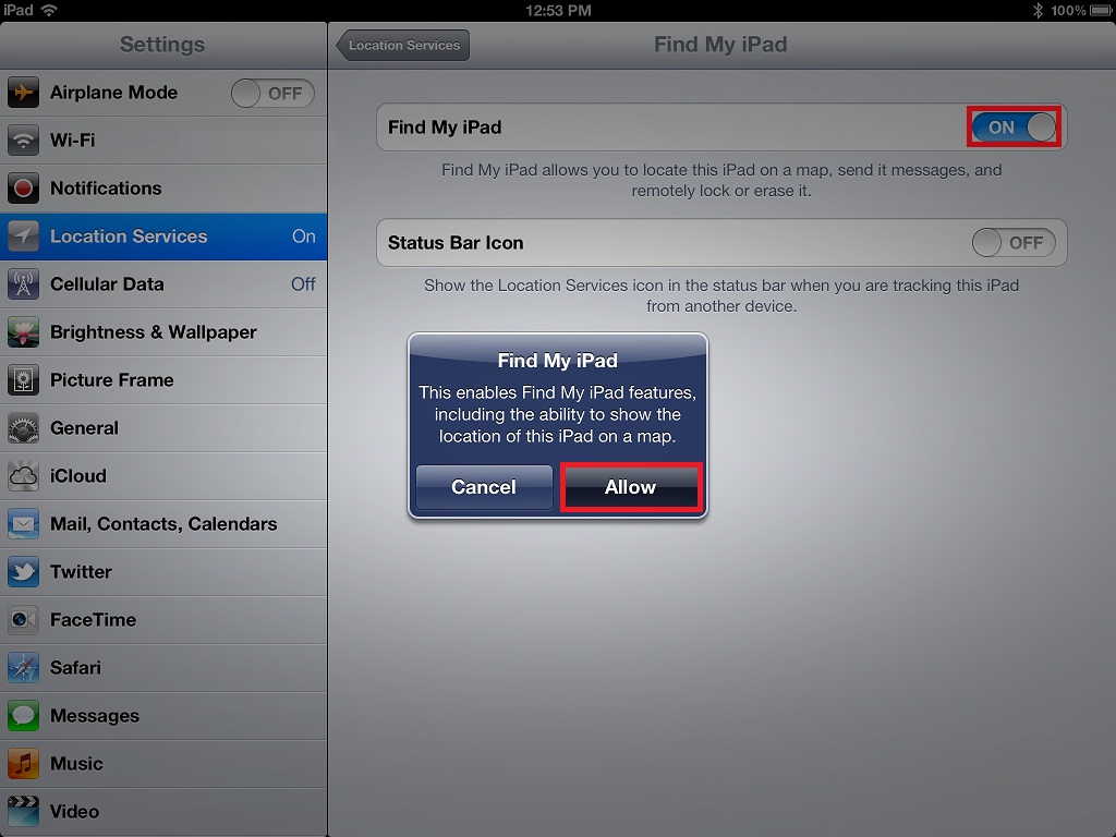 Toggle the Find my iPad to the ON position, then tap the Allow button in the dialog window.